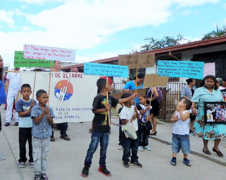 C’est le dimanche 16 octobre, à l’occasion de la Journée mondiale du refus de la misère, qu’a eu lieu la célébration des 25 ans. Tôt le matin, les familles du quartier de “La Bolsa” se sont mobilisées pour aller retrouver les habitants de la colonie “Nueva Suyapa” et vivre avec eux “un jour d’amitié et de communion” disait Esteban Zepeda. Les familles des différents quartiers, et les jeunes d’hier et d’aujourd’hui, la majorité d’entre eux accompagnés de leurs enfants et de leurs familles s’étaient donné rendez-vous au Centre paroissial. Ce furent d’immenses retrouvailles !