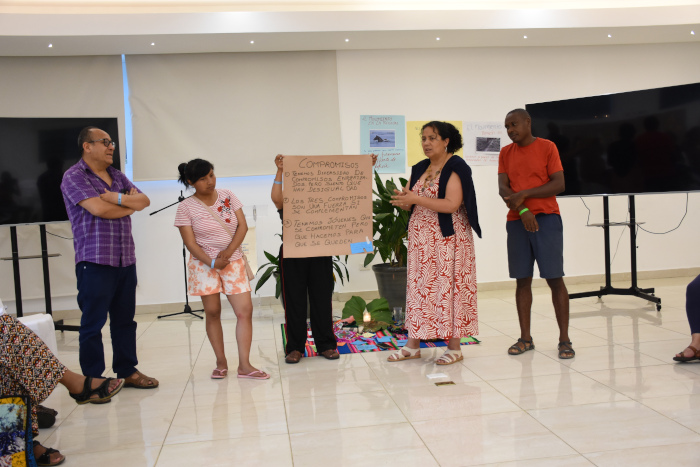 Le choix du lieu n’était pas un hasard. Le Complexe de Conférences Internationales Cha Cha, situé dans la zone frontalière entre Dajabón (République Dominicaine) et Ouanaminthe (Haïti), est l’un des rares espaces où les Haïtiens peuvent se rendre sans visa. Cet emplacement visait à garantir la participation de Saint Jean L’herissant, membre de l’équipe Jean Rabel en Haïti. Les autres membres de cette région et de la ville de Port-au-Prince nous ont rejoint virtuellement, pour se sentir proches les uns des autres et unis même s’ils n’ont pas pu se déplacer.