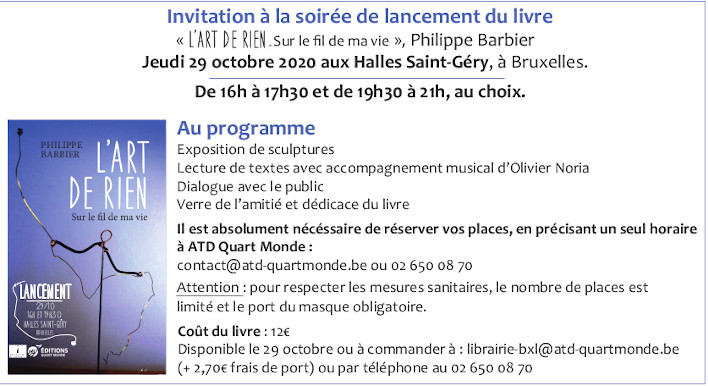 Le lancement du livre aura lieu aux Halles Saint Géry, à Bruxelles, le 29 octobre 2020. Au programme, une lecture musicale au milieu des sculptures de l’auteur, suivie d’un échange avec la salle et d’un verre de l’amitié.